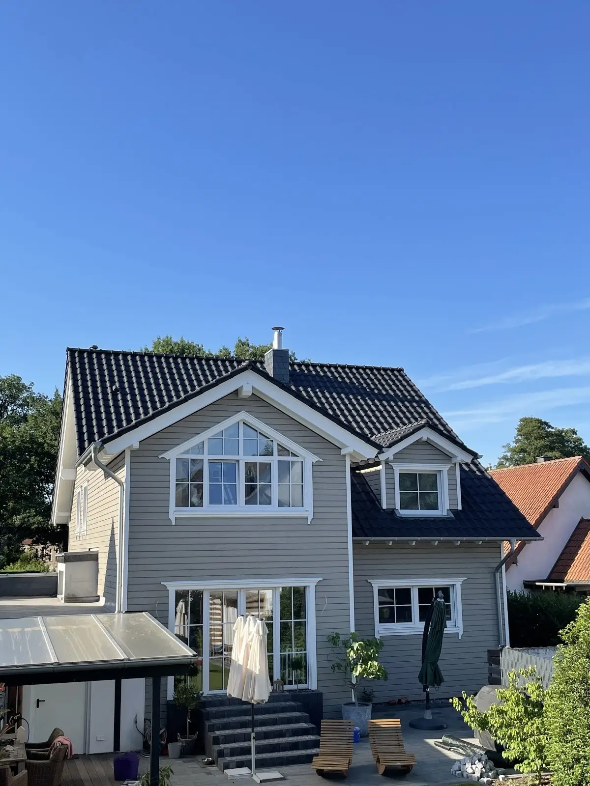 Energetische Steildachsanierung mit geschieferten Dachrändern und Kamin