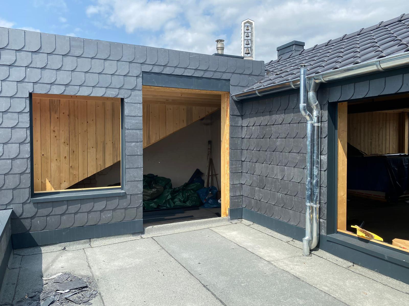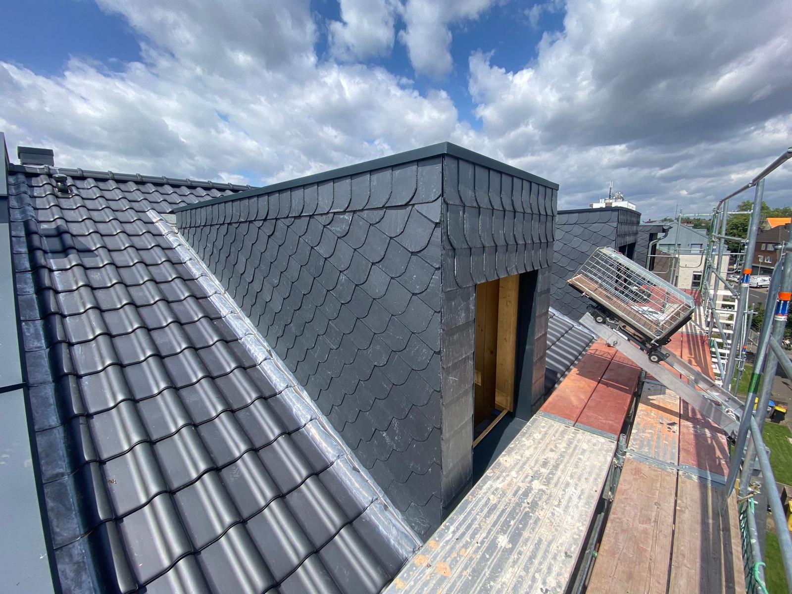 Steildachsanierung mit Schiefer bekleidete Dachgaube und Dachränder